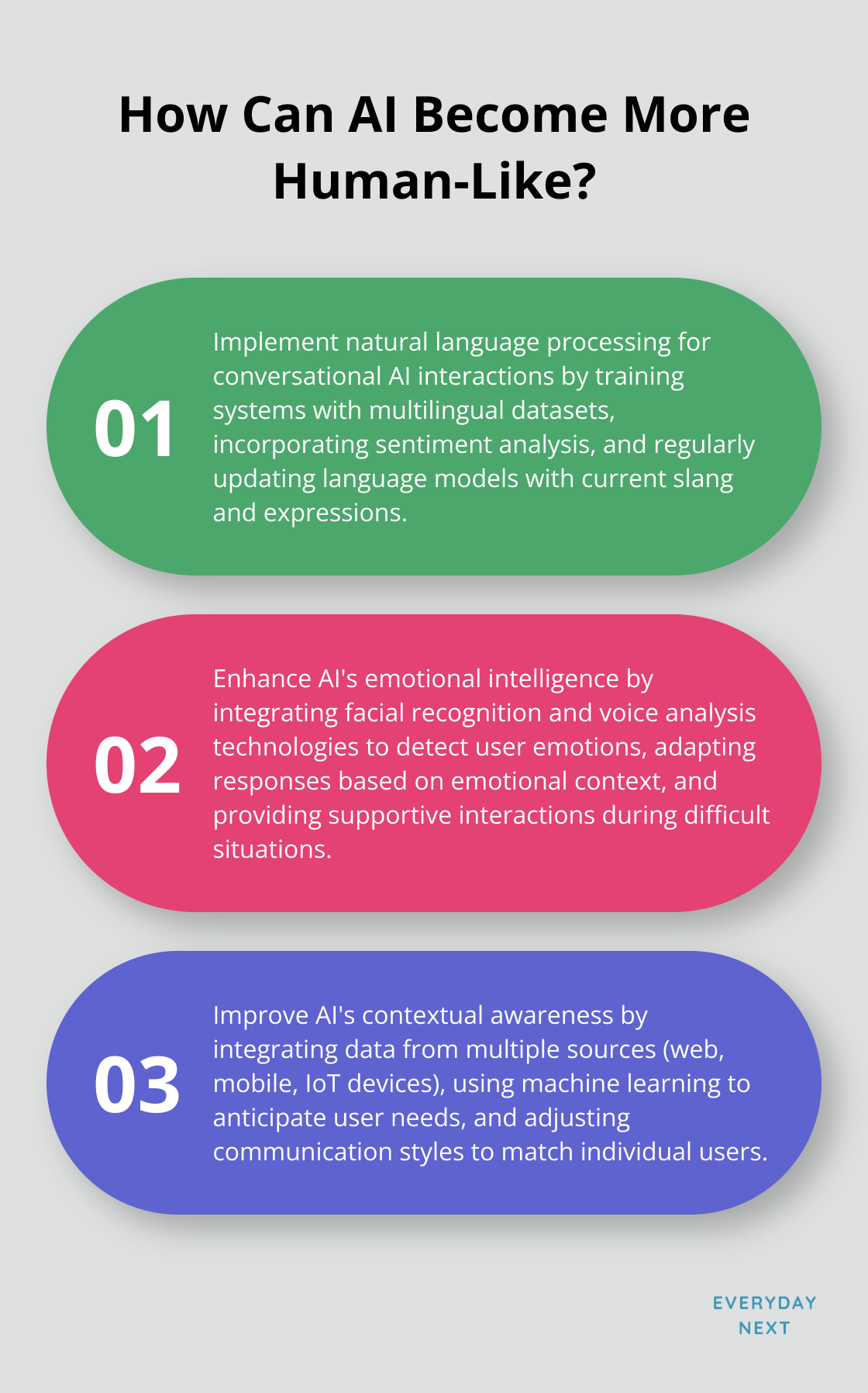 At Everyday Next, we’re all about making our robot friends just a smidge more human. Practical solutions-yep, that’s the name of the game in giving AI a splash of humanity. Ready to dive into the playbook for this challenge? Let’s go.